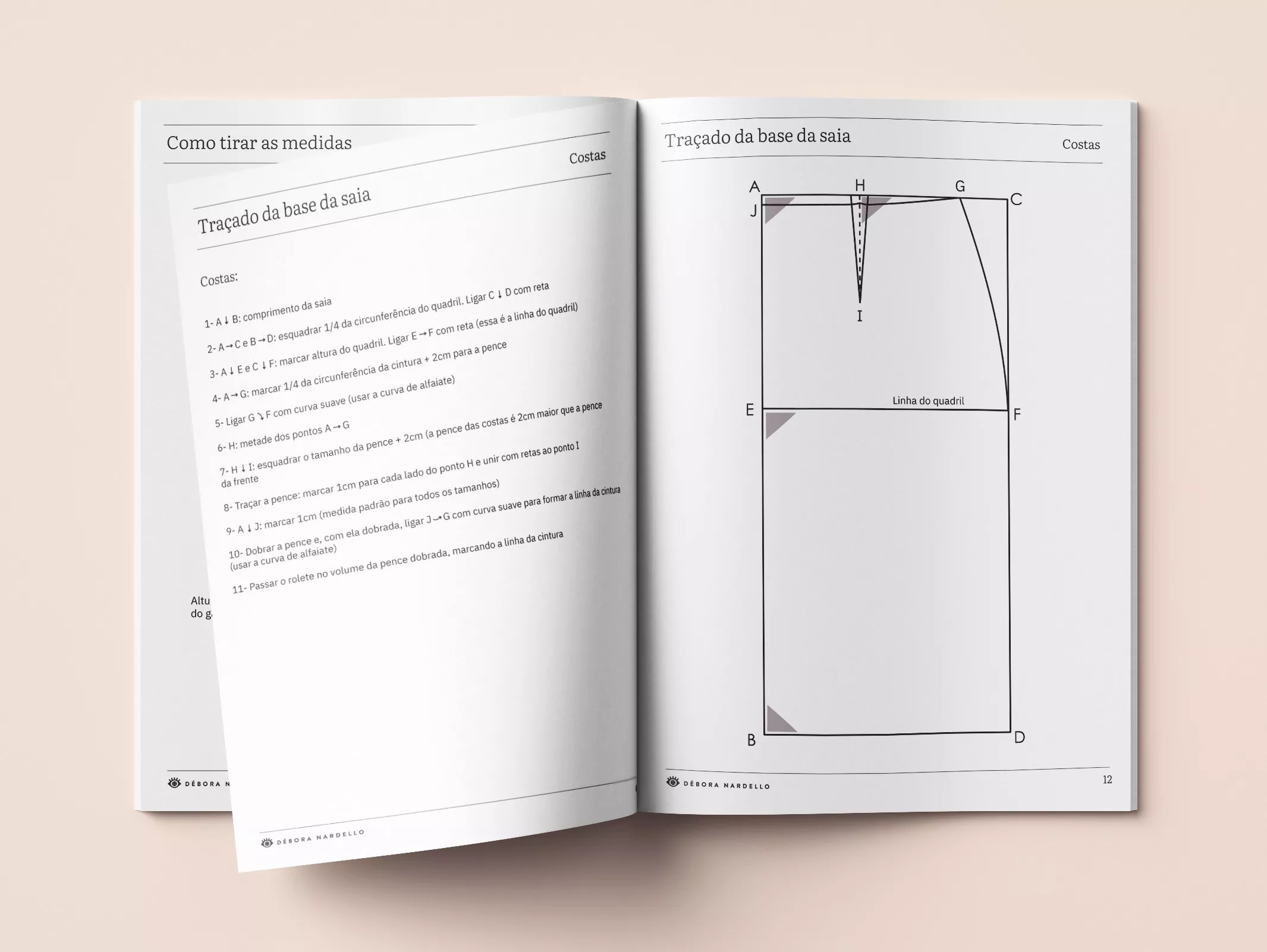 O ebook contém o passo-a-passo ilustrado para traçar bases de saia, blusa, manga e calça, além de instruções para aferir medidas do corpo e uma tabela de medida feminina.